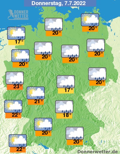 Am Donnerstag bleibt es zunächst verbreitet stark bewölkt und es bilden sich wiederholt Schauer, lokal sind auch Gewitter möglich. Am Nachmittag heitert es dann im Westen und Norden wieder auf und es bleibt trocken. Die Temperatur steigt auf 17 Grad in Erfurt und bis 23 Grad in Bonn.