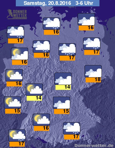 In der Nacht zum Samstag ziehen die dichten Wolken und die zeitweiligen Niederschläge im weiteren Verlauf auch in den Norden und Osten Deutschlands. Im Westen lockert es gegen Morgen meist wieder auf und dann bleibt es hier weitgehend trocken. Im Süden ist es teils aufgelockert, teils stark bewölkt, jedoch überwiegend trocken. Die Temperatur sinkt auf 18 Grad in Dresden und bis 14 Grad am Westerwald.