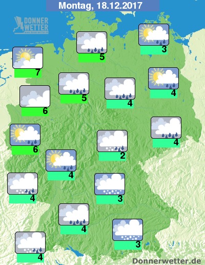 Am Montag klingen die Niederschläge im Westen und Nordwesten nach und nach ab und es sind hier Auflockerungen möglich, sonst bleibt es aber überwiegend bei starker Bewölkung und es fällt zeitweise Regen, Schneeregen oder Schnee. Die Temperatur steigt auf 2 bis 7 Grad.