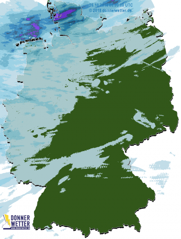 Heute zeigen sich im Norden und Nordwesten gebietsweise heitere Abschnitte, zum Teil ziehen hier aber auch dichte Wolken durch, Schauer bilden sich dabei jedoch nur selten. Weiter nach Südosten hin bleiben die Wolken weitgehend dicht und etwa südlich des Mains fällt zeitweise Regen, sonst bleibt es hingegen weitgehend trocken. Die Temperatur erreicht nur noch 8 bis 11 Grad.