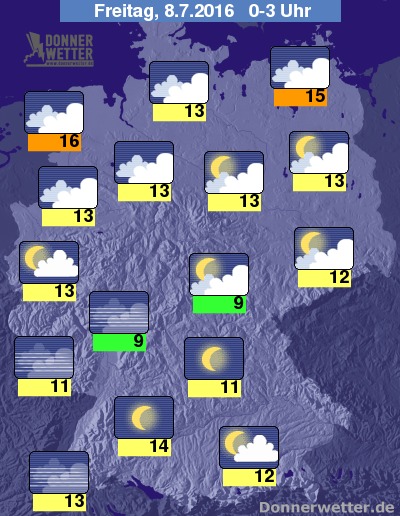In der Nacht zeigt sich der Himmel im Norden und Osten des Landes teils bedeckt, teils aufgelockert bewölkt. Im Süden bleibt es meist klar oder nur locker bewölkt, regional kann sich Nebel bilden.