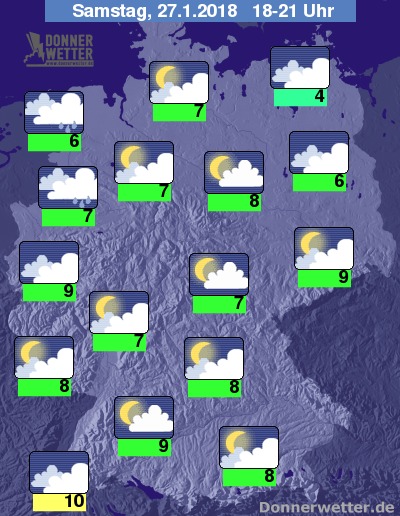 Heute Nachmittag zeigt sich im Land häufig die Sonne und es ziehen meist nur lockere bis aufgelockerte Wolken durch, dabei bleibt es trocken. Vor allem über Sachsen und dem Alpenvorland bleibt es auch oft stark bewölkt oder trüb, jedoch meist trocken. Die Temperatur liegt bei 4 Grad in Stralsund und bis 10 Grad im Breisgau.