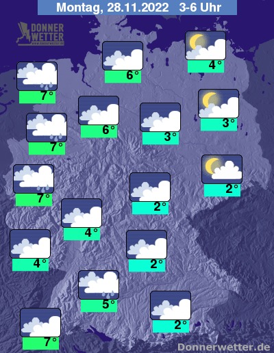 In der folgenden Nacht zeigt sich der Himmel über den östlichen Landesteilen zunächst noch oft aufgelockert bewölkt, sonst ist es dagegen verbreitet dicht bewölkt und vom Niederrhein, über das westliche Niedersachsen bis nach Schleswig-Holstein fällt gebietsweise Regen. In den übrigen Landesteilen bleibt es weitgehend trocken bei Tiefstwerten von 7 Grad am Niederrhein bis 2 Grad in Mittelfranken.