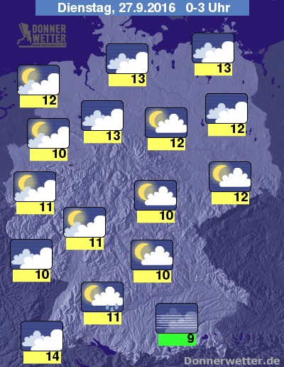Die Temperaturen sinken in der Nacht auf Werte um 12 Grad C im Vogtland und um 8 Grad C am Alpenrand.