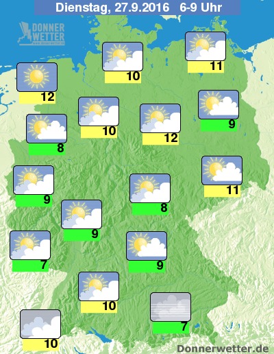 Die Temperaturen liegen in den Morgenstunden bei Werten um 7 Grad C im Saarland und um 12 Grad C in Emden.