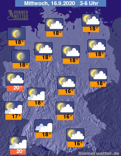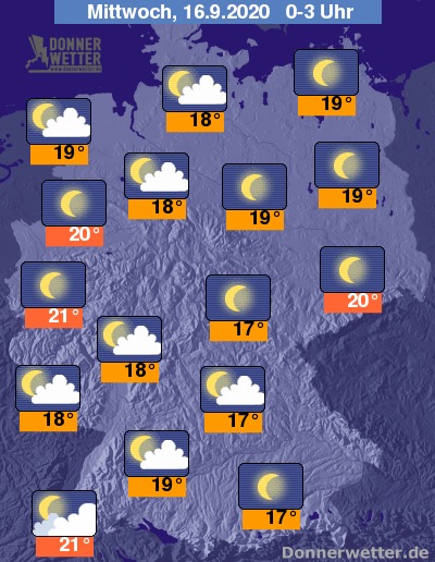 Bis zu den Frühstunden kühlt die Luft auf 20 bis 16 Grad ab. In den Ballungsgebieten des Westens, sowie auf kleineren Berghängen im Südwesten und Westen kann es zu einer tropischen Nacht mit Temperaturen oberhalb der 20 Grad-Marke kommen.