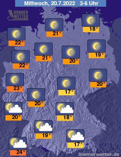 In der folgenden Nacht zieht im Süden gebietsweise lockere bis aufgelockerte Bewölkung durch, im übrigen Land bleibt es dagegen weitgehend sternenklar. Die Temperatur sinkt auf tropische 24 Grad in Freiburg und etwas kühlere 17 Grad in Jena, dabei bleibt es trocken.