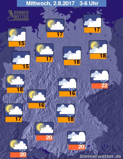 Am Mittwoch zeigt sich das Wetter zum Teil aufgelockert, oft jedoch auch stark bewölkt. In den westlichen Landesteilen bleibt es mehrheitlich trocken, sonst bilden sich hingegen gebietsweise Schauer, im Süden und Osten auch örtliche Gewitter. Die Temperatur steigt auf 21 Grad in Emden und bis 32 Grad in München.