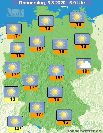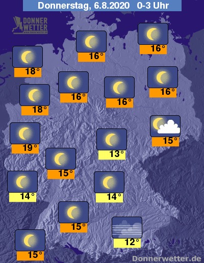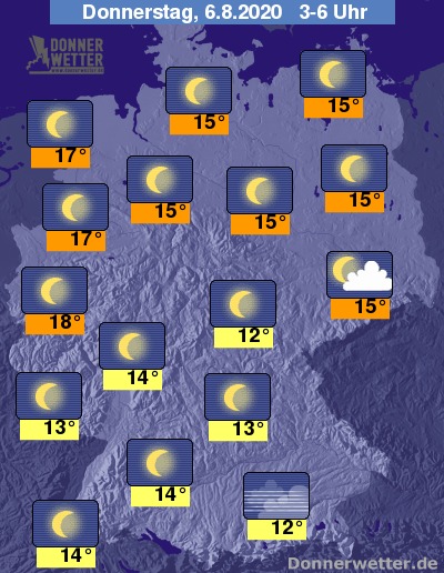 Die Tiefsttemperaturen bewegen sich unter dem Tropennacht-Niveau von 20 Grad und sinken auf Werte um 18 Grad in der Kölner Bucht, um 12 Grad am Alpenrand.