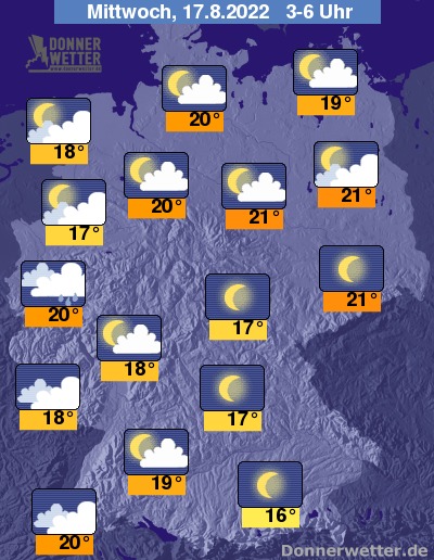 In der folgenden Nacht zeigt sich der Himmel über Bayern, Thüringen und Sachsen meist sternenklar. Vor allem in den westlichen Landesteilen ziehen oft viele und teils dichte Wolken durch, hier sind einzelne Schauer möglich. Im übrigen Land ist es locker bis aufgelockert bewölkt und trocken. Die Temperatur sinkt auf 21 Grad in Berlin und 16 Grad in München.