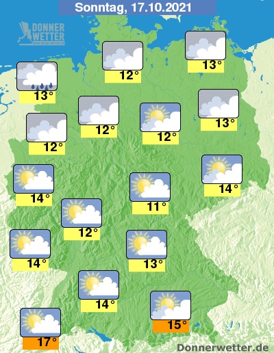 Am Sonntag ist es im Süden überwiegend heiter, teils ziehen hier auch einige Wolken durch, dabei bleibt es trocken. In der übrigen Republik ist es zumeist stark bewölkt, dabei bleibt es zunächst überall trocken, am Nachmittag können sich im Norden jedoch gebietsweise Schauer bilden. Die Höchstwerte erreichen 11 Grad im Eichsfeld und bis 17 Grad im Oberrheingraben.