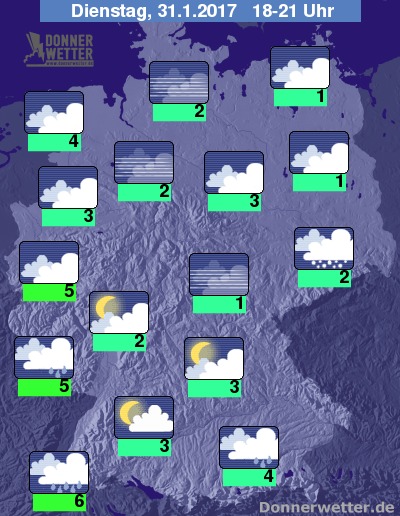 Heute Nachmittag fällt im Alpenvorland bei kompakten Wolken zum Teil langanhaltender und ergiebiger Regen oder Schneeregen. Im übrigen Bundesgebiet ist es zumeist bedeckt oder trüb, nur hier und da auch aufgelockert bewölkt, dabei fällt im Osten gebietsweise Schnee, sonst bleibt es aber größtenteils trocken. Die Temperatur steigt auf 1 Grad in Vorpommern und bis etwa 6 Grad im Oberrheingraben.