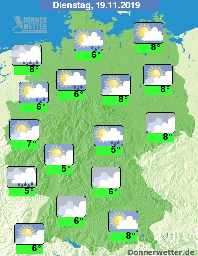 Am Dienstag ist es über der Bundesrepublik meist stark, vorübergehend aber auch mal locker bis aufgelockert bewölkt. Im Süden und Osten bleibt es weitgehend trocken, während es sonst gebietsweise regnen kann. Die Temperatur steigt auf 5 Grad im Saargau und bis 8 Grad an Nord- und Ostsee.
