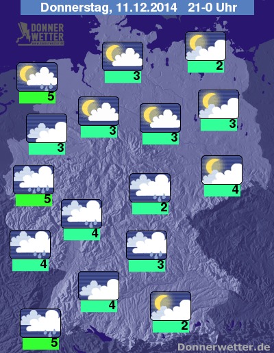 Am Abend lockern die dichten Wolken vor allem im Norden, aber auch im Osten häufig auf, so dass mehr und mehr Sterne zum Vorschein kommen, dazu bleibt es hier auch weitestgehend trocken. In den anderen Landesteilen halten sich dagegen meist dichte Wolken und es fällt zeitweise weiterer Regen nach Süden und Südosten hin auch Schnee oder Schneeregen mit einhergehenden Glättegefahren. Im Süden weht meist nur schwacher bis mäßiger, sonst aber überwiegend frischer bis starker, an den Küsten weiterhin auch teils stürmischer Wind mit möglichen orkanartigen Böen. Die abendlichen Temperaturen liegen bei 6 Grad in Aachen und etwa 2 Grad in München.