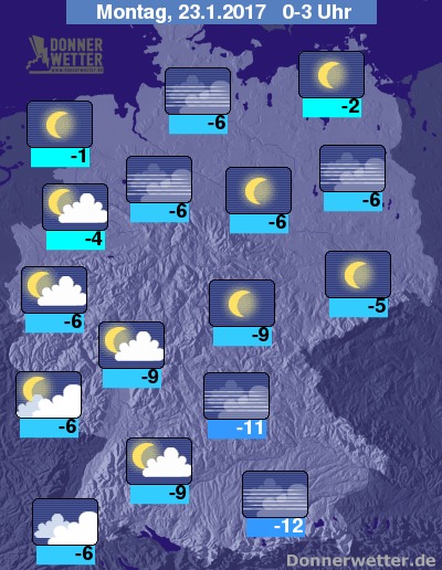 Die Temperaturen sinken auf Werte um -1 Grad C in Ostfriesland und um -12 Grad C in den südlichen Mittelgebirgen.