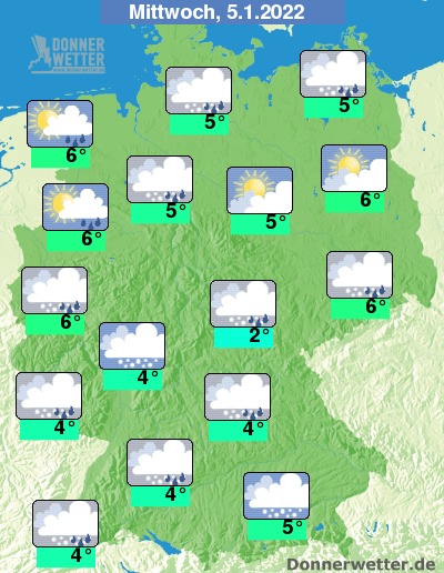 Am Mittwoch ist es größtenteils stark oder dicht bewölkt. In einem Streifen vom Saarland bis nach Brandenburg zeigen sich vorübergehend auch Auflockerungen. Sonst und im übrigen Land fällt gebietsweise Regen oder Schnee. Im Süden fallen die Niederschläge meist als Schnee. Die Temperatur erreicht 2 Grad in Jena und bis 6 Grad in Meppen. Im Norden weht ein oft stürmischer Wind.
