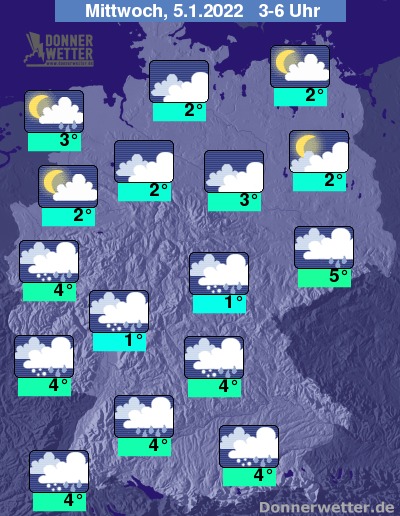In der Nacht zum Mittwoch lockert es im Norden gebietsweise auf, sonst bleibt es verbreitet bedeckt und über der Südhälfte fällt immer wieder Regen, der bis zum Morgen immer mehr auch in Schneeregen oder Schnee übergeht. Weiter nach Norden hin bleibt es größtenteils trocken. Die Temperatur sinkt auf 4 Grad am Oberrhein und etwa 1 Grad im Thüringer Becken.