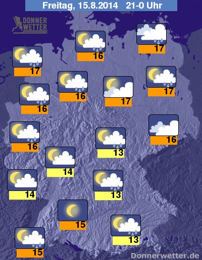 In der Nacht zum Samstag fallen zunächst noch zeitweise weitere Schauer, Gewitter treten seltener auf, ab der zweiten Nachthälfte lässt auch die Schauerneigung spürbar nach, so dass es dann nur noch vereinzelt zu Schauern kommen kann, sonst bleibt es meist trocken. Die Temperatur sinkt auf 14 Grad an der nördlichen Ems und 8 Grad im Allgäu.
