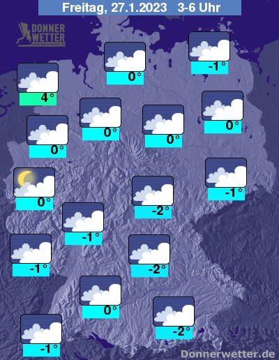 Am Freitag zeigen sich vor allem im Nordwesten Auflockerungen, sonst ist es überwiegend bedeckt oder trüb, hier und da sind auch mal ein paar Flocken möglich. Die Temperatur erreicht -1 Grad im Grabfeld und bis 4 Grad im nördlichen Emsland.