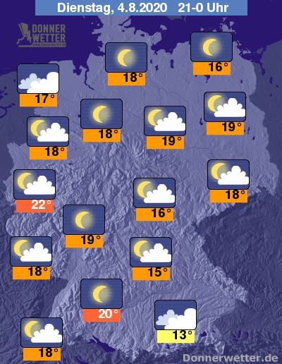 Die Temperaturen gehen im Abendverlauf auf Werte um 22 Grad in der Kölner Innenstadt und 13 Grad im Berchtesgadener Land zurück.
