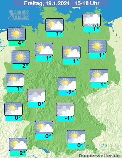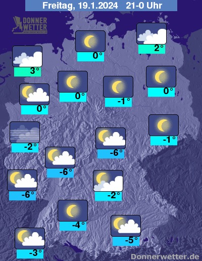 Die Temperaturen gehen auf Tiefstwerte um 2 Grad in Küstennähe zurück, sonst leichter bis mäßiger Frost bei -1 bis -11 Grad.