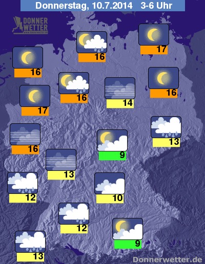 Sonst lockert die Bewölkung aber mehr und mehr etwas auf und besonders im Norden und Nordwesten wird es häufig klar. Dazu bleibt es dort weitgehend trocken. Die Temperatur sinkt bis zum Morgen auf 17 Grad am Niederrhein und etwa 9 Grad im Thüringer Wald.