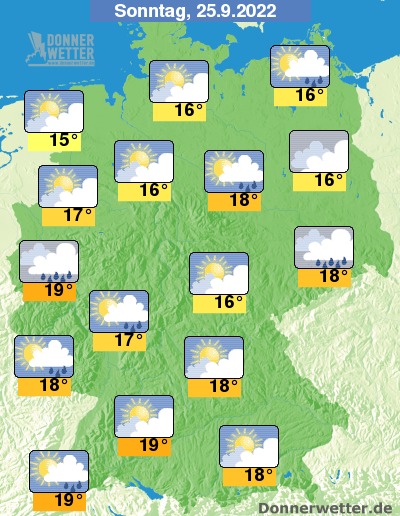 Am Sonntag zieht zum Teil lockere, oft jedoch starke Bewölkung durch, dabei bilden sich hier und da einzelne Schauer. Die Temperatur erreicht 15 Grad in Cuxhaven und bis 19 Grad in Stuttgart.