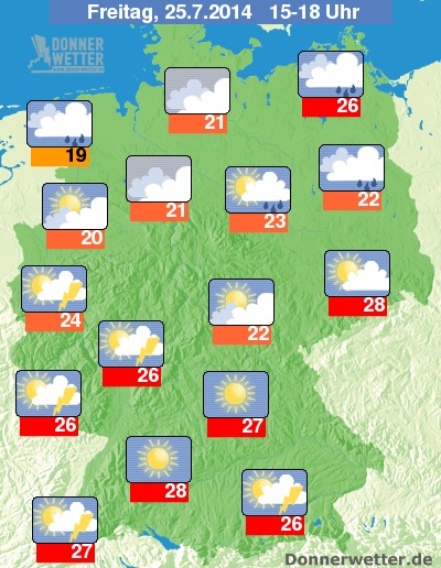 Heute Nachmittag fällt vor allem im Nord und Osten weiterhin zeitweise Regen, im Westen bilden sich bei häufig dichten Quellwolken mögliche Schauer und Gewitter, sonst ist es überwiegend locker oder aufgelockert bewölkt und es können sich örtlich einzelne Schauer und Gewitter bilden. Die Temperatur liegt bei 19 Grad in Emden und bis 28 Grad in Karlsruhe.