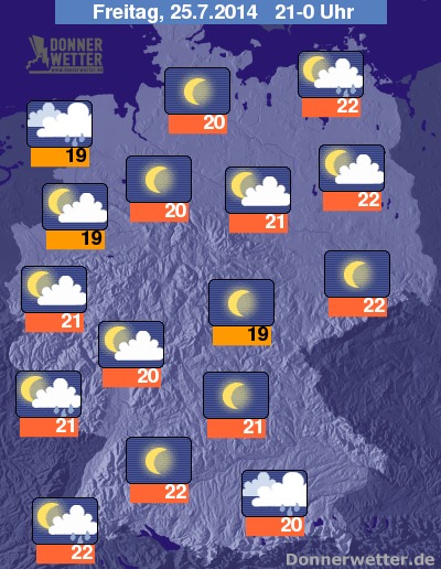 Heute Abend ziehen vor allem vom Westen, über den Nordwesten bis nach Nordosten weiterhin vielfach dichte Quellwolken durch, und es entladen sich teils kräftige Schauer und Gewitter, sonst ist es überwiegend nur locker oder aufgelockert bewölkt und trocken, jedoch besteht auch hierbei ein leichtes Schauer- und Gewitterrisiko. Die Abendtemperatur liegt bei schwülwarmen 22 Grad in Berlin und nur wenig kühleren 19 Grad am Thüringer Wald.