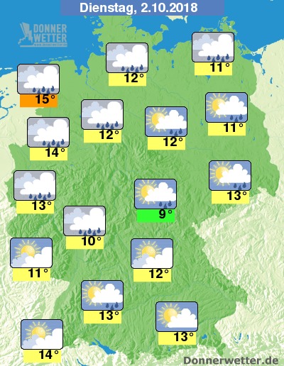Die Höchsttemperaturen liegen deutschlandweit zwischen herbstlichen 9 bis 15 Grad. Die höchsten Werte werden dabei wohl noch im Emsland und vielleicht auch im Breisgau erreicht. Am kühlsten ist es unter den dichten Regenwolken.