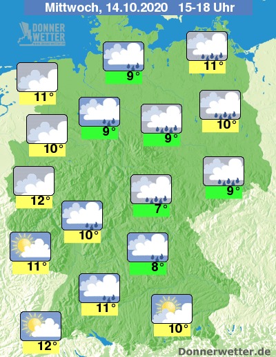 Bis zum frühen Abend ändert sich an den Wetter- und Temperaturverhältnissen nicht viel. Der Regen dehnt sich noch etwas weiter nach Westen hin aus und erreicht in abgeschwächter Form auch Teile Schwabens und das Rhein-Main-Gebiet.