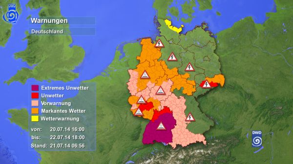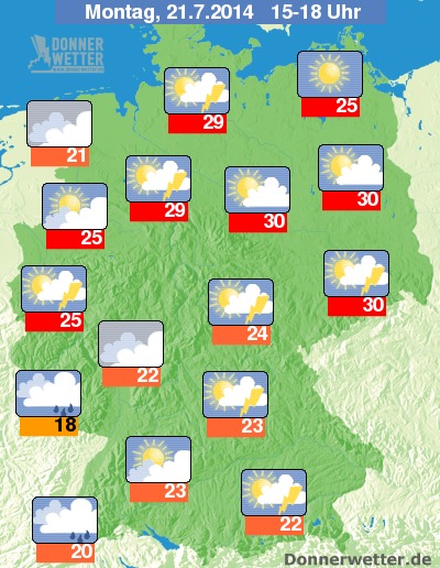 Heute Nachmittag ist es verbreitet stark bewölkt und nur hier und da zeigt sich die Sonne für längere Zeit. Besonders freundlich ist es jedoch im Nordosten hier bleibt es bei häufigem Sonnenschein weitgehend trocken, in den übrigen Landesteilen muss hingegen wiederholt mit Schauern und Gewittern, sowie mit teils anhaltendem und ergiebigem Regen gerechnet werden. Die Temperatur liegt bei kühlen 18 Grad am Pfälzer Wald und 30 Grad in Berlin.