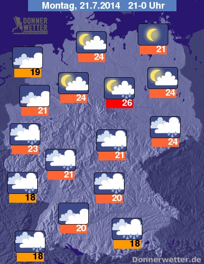 Am Abend ist es von der Mitte bis nach Süden weiterhin meist stark bewölkt und es fällt vielfach gewittriger und vor allem nach Südosten noch ergiebiger Regen. Im Norden ist es dagegen häufig aufgelockert bewölkt und besonders im Ostseeumfeld auch häufig klar und es bleibt meist trocken. Die Temperatur liegt bei 26 Grad in Dessau und etwa 18 Grad am Alpenrand.