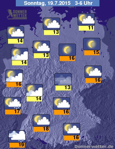 Weiter nach Norden hin zeigt sich der Himmel meist locker bewölkt oder sternenklar, hier und da ziehen jedoch auch mehr Wolken durch, es bleibt aber trocken. Die Temperatur sinkt auf 19 Grad in Freiburg und bis 11 Grad an der Müritz.