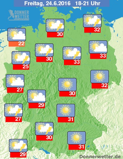 Heute Abend bilden sich über dem Norden und dem Südwesten zeitweise Schauer und zum Teil auch schwere Gewitter. Zwischendrin ist aber auch Sonnenschein möglich. Weitgehend sonnig und trocken ist es vom Osten bis in den Südosten Deutschland, hier bleibt es weitgehend trocken. Im übrigen Land ist es teils heiter, teils auch stärker bewölkt, jedoch meist trocken. Die Temperatur liegt bei 22 Grad in Ostfriesland und 32 Grad im Leipziger Land.