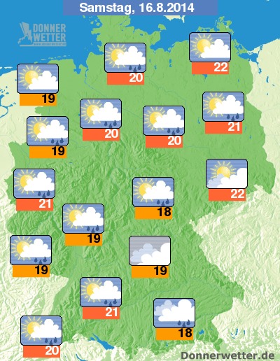 Heute herrscht wiederum vielfach wechselhaftes Wetter vor, dabei scheint vor allem am Vormittag auch häufig die Sonne, es können jedoch ebenso Schauer und einzelne Gewitter auftreten. Besonders am Nachmittag sind vermehrt Schauer und besonders im Osten auch Gewitter unterwegs, dazwischen kann sich aber auch mal die Sonne zeigen. Die Temperatur steigt auf frühherbstliche 18 Grad am Thüringer Wald und wärmere 22 Grad in der Lausitz.