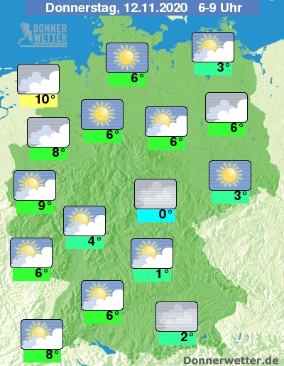 Bis zu den Frühstunden kühlt die Luft auf 10 bis 2 Grad ab, stellenweise kann es zu leichtem Frost kommen; am mildesten bleibt es in der Kölner Bucht und an der Emsmündung.