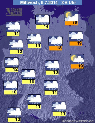 In der Nacht zum Mittwoch hält das regnerische und vor allem im Osten auch gewittrige Wetter an. Auflockerungen sind am ehesten im Ostseeumfeld möglich. Die Temperatur sinkt auf 19 Grad in Berlin und 10 Grad im Pfälzer Wald.