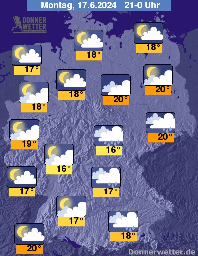 Am Montagnachmittag zeigt sich der Himmel überwiegend wechselnd, im Südwesten auch stark bewölkt, und es muss zeitweise mit Schauern und Gewittern gerechnet werden. Überwiegend trocken bleibt es bei längeren sonnigen Abschnitten im äußersten Nordwesten.
