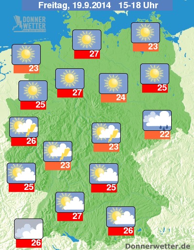 Heute Nachmittag können sich in einem breiten Streifen von Westdeutschland, über die Mitte bis in den Osten zeitweise Schauer und teils kräftige Gewitter entwickeln, im Süden ist es meist heiter oder aufgelockert bewölkt und überwiegend trocken, im Norden ist es verbreitet sonnig und es bleibt weitgehend trocken. Die Temperatur liegt bei 23 Grad in Rostock und etwa 27 Grad in Karlsruhe.