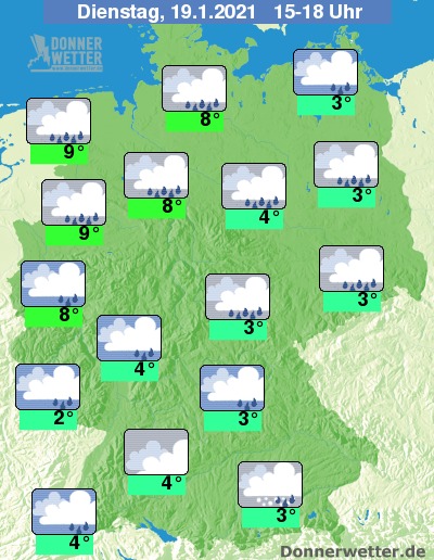 Am frühen Nachmittag zieht eine Warmfront mit Niederschlägen über die Landesmitte und den Norden hinweg. Nach Osten hin fällt noch häufig Schnee oder Schneeregen mit Glättegefahr, später allgemein Regen oder Sprühregen. Südlich der Donau bleibt es weitgehend trocken.