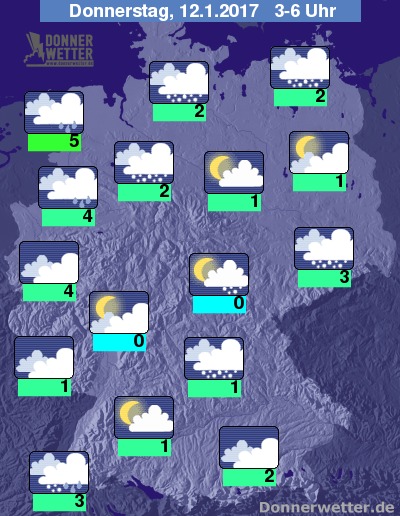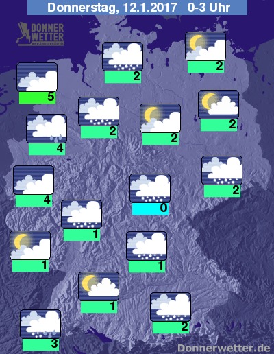 Der Donnerstag startet mit vielen Wolken und nur wenigen Sonnenstrahlen, die es ab und zu im Nordosten durch die Wolken schaffen. Im Nordosten Schneefall und Richtung Westen Schneeregen oder Regen möglich. Vor allem in der Nordhälfte und auf den Gipfeln der Mittelgebirge teils starke Sturmböen.