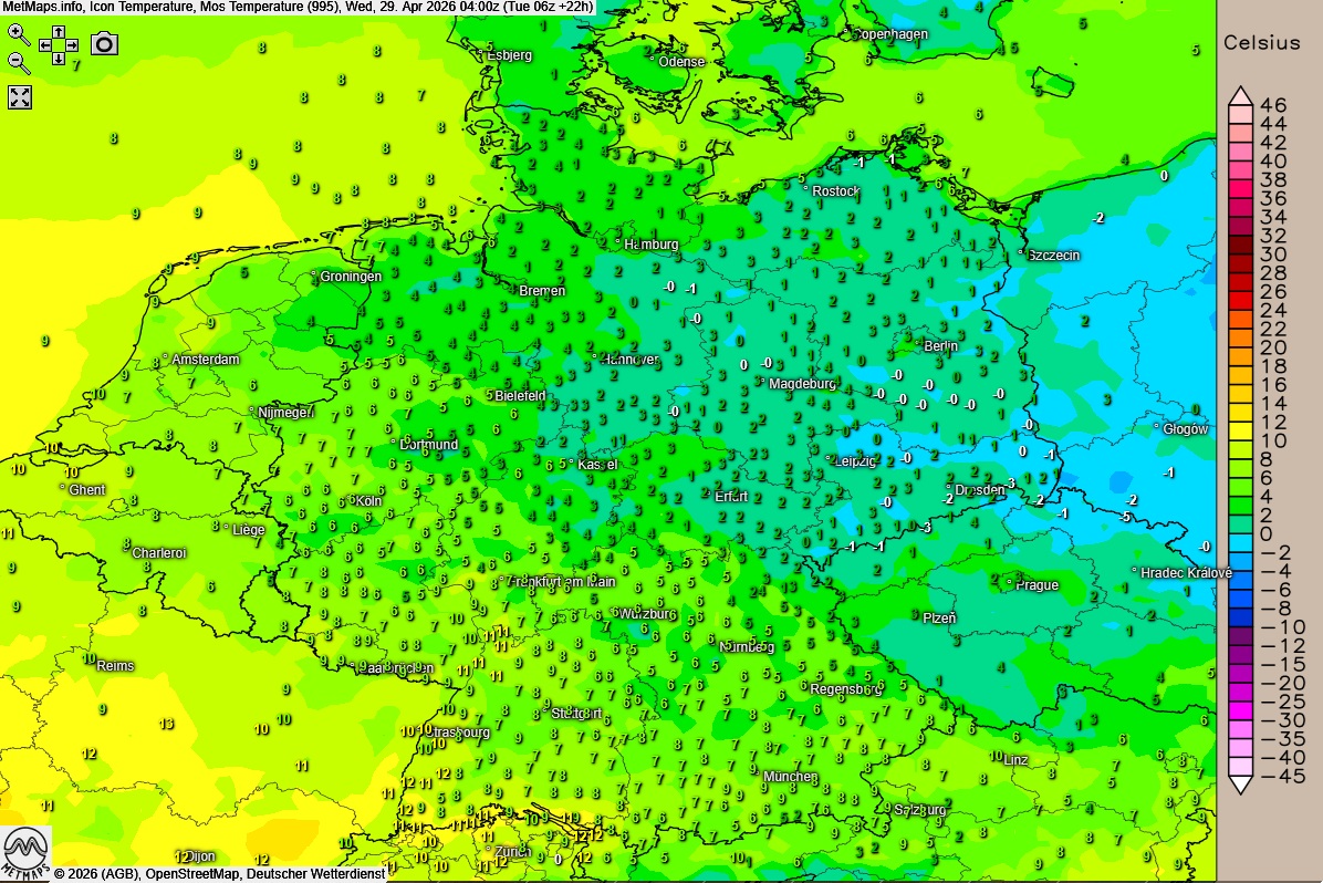 Lufttemperaturen Mittwochmorgen (04:00 Uhr) nach ICON