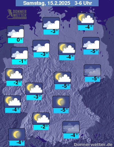 In der Nacht zum Samstag zeigt sich der Himmel über dem Westen und Südwesten sowie über dem Nordosten nur gering bewölkt oder es ist sternenklar. In den übrigen Landesteilen überwiegt starke Bewölkung, es bleibt aber weitgehend niederschlagsfrei.