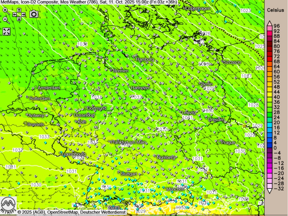 Die Strömungskarte sowie die Temperaturen und Temperaturabweichungen für Samstagnachmittag (15:00 Uhr) nach Icon-D2: