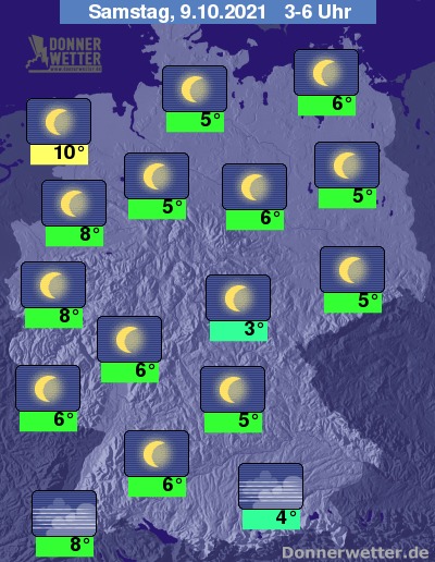 In der Nacht zum Samstag zeigt sich der Himmel über Deutschland verbreitet sternenklar. Im Alpenvorland ist es gebietsweise auch neblig-trüb oder stärker bewölkt, dazu bleibt es trocken. Die Temperatur sinkt auf 10 Grad in Wilhelmshaven und bis 3 Grad in Jena.