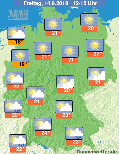 Wer im Norden wohnt wird am frühen Nachmittag von reichlich Sonnenschein verwöhnt. Über der Mitte und im Süden wechseln sich Sonne und Wolken miteinander ab. Über dem Saarland, der Pfalz, dem Breisgau und den Gebieten südlich der Donau können sich mit sonniger Einstrahlung mächtigere Haufenwolken zusammen brauen, die sich in Form örtlicher Regengüsse entladen, vereinzelt auch in Verbindung mit Blitz und Donner. Die Temperaturen liegen allgemein zwischen 20 und 24 Grad. Im Emsland bleibt es etwas kühler, im Süden kann es stellenweise etwas wärmer werden. Der Wind weht allgemein nur schwach.