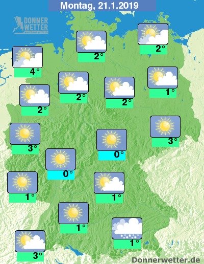 In der Nacht zum Montag zeigt sich der Himmel verbreitet sternenklar und es ziehen nur hier und da wenige Wolken durch. Direkt am Alpenrand ist es jedoch weiterhin stark bewölkt, dazu fällt hier gebietsweise auch Schnee, im übrigen Land bleibt es jedoch trocken. Die Temperatur sinkt auf 0 Grad an der Nordsee und bis -6 Grad im Thüringer Becken.