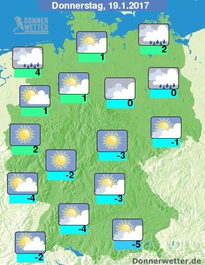 Dazu Temperatruen um plus 4 Grad C an der Nordsee und um minus 5 Grad C in Oberbayern.