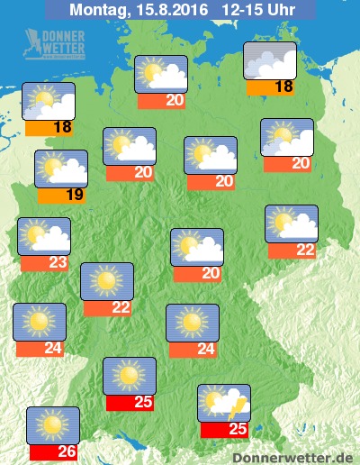 Heute Nachmittag ist es über der Nordhälfte der Bundesrepublik meist wechselnd, teils aber auch leicht oder stark bewölkt, dazu bleibt es trocken. Weiter nach Süden hin ist es verbreitet sonnig, im Alpenvorland bilden sich oft einige Quellwolken, dazu sind örtliche Schauer und Gewitter möglich. Die Temperatur steigt auf 18 Grad an der Müritz und bis 26 Grad im Oberrheingraben.
